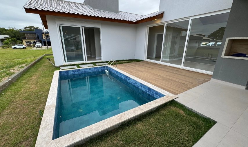 Casa de alto padrão, localizada no Condomínio Villa Suíça, em Balneário Rincão, próximo a mercados e padarias, a apenas 590 metros da beira da lagoa.